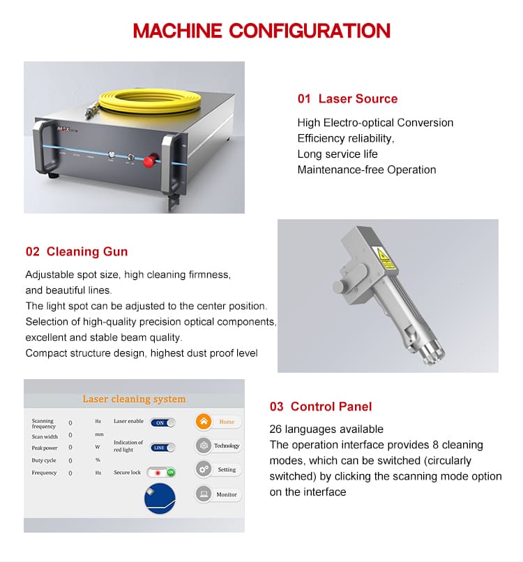 باعتبارها آلة تنظيف بالليزر غير متصلة، فهي لا تلحق الضرر بركيزة الأجزاء، ولا توفر الطاقة والمواد الاستهلاكية وحماية البيئة، ويمكنها إزالة الراتنج والزيت والبقع والأوساخ/الصدأ والطلاء والكسوة والطلاء بكفاءة من سطح قطعة العمل لتلبية متطلبات التنظيف في النمذجة المعقدة والوضع الدقيق في مجال المعالجة الصناعية، وتحقيق درجة نظافة أعلى من تأثير التنظيف، وفوائد الإنتاج بتكلفة شاملة أقل.