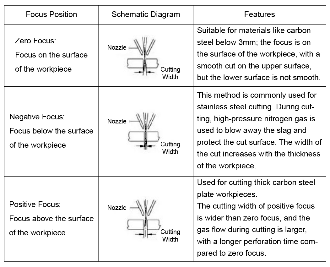 قطع لوحة متوسطة وسميكة:بالنسبة للألواح المتوسطة السمك ، لضمان جودة حافة جيدة ، يتم تبني التركيز السلبي عادة. يتم ضبط التركيز بشكل أعمق داخل المادة لتوسيع القطع وتحسين تدفق المواد المنصهرة ، مما يضمن تطبيق كثافة الطاقة الكافية على منطقة القطع.
